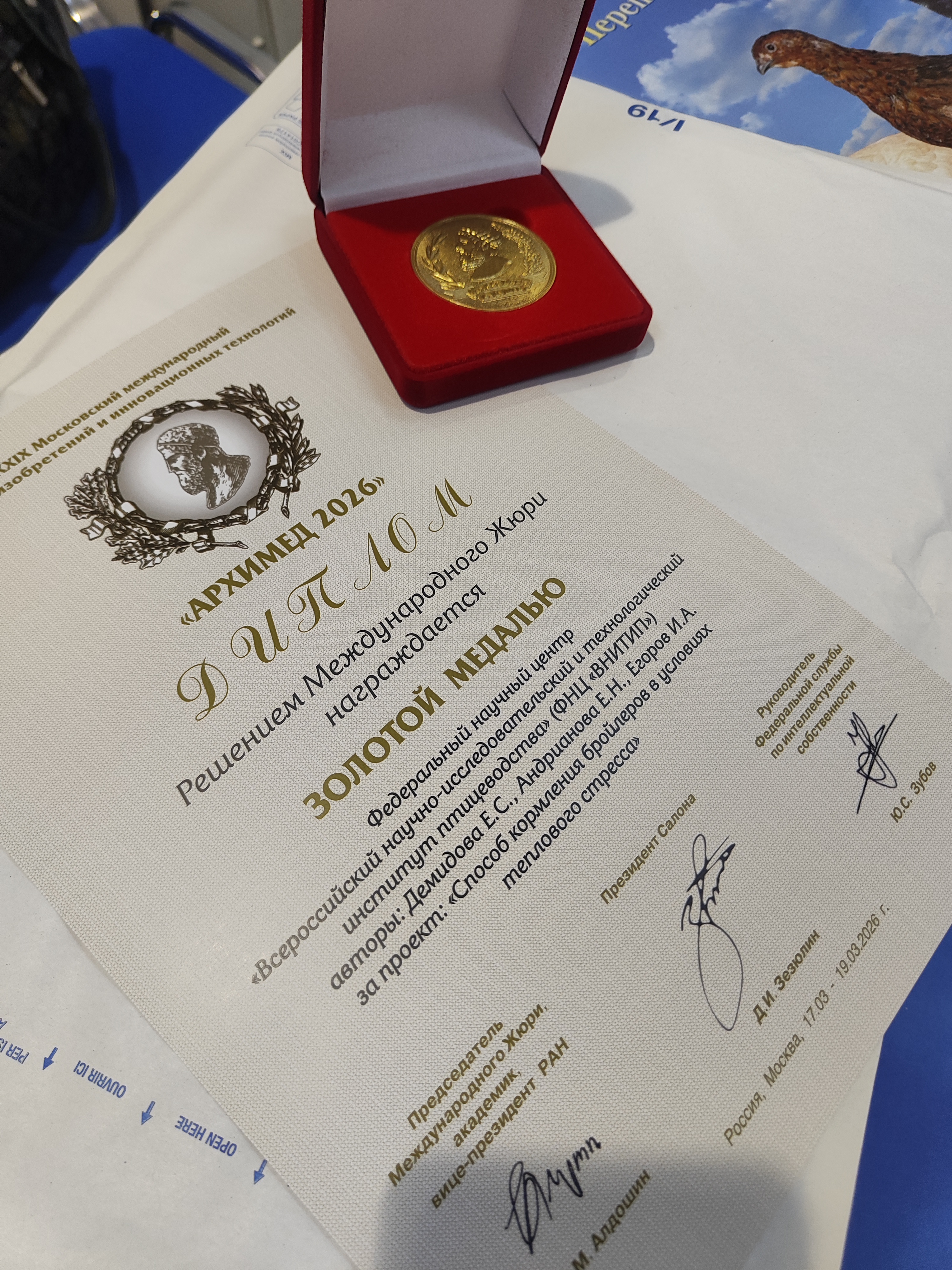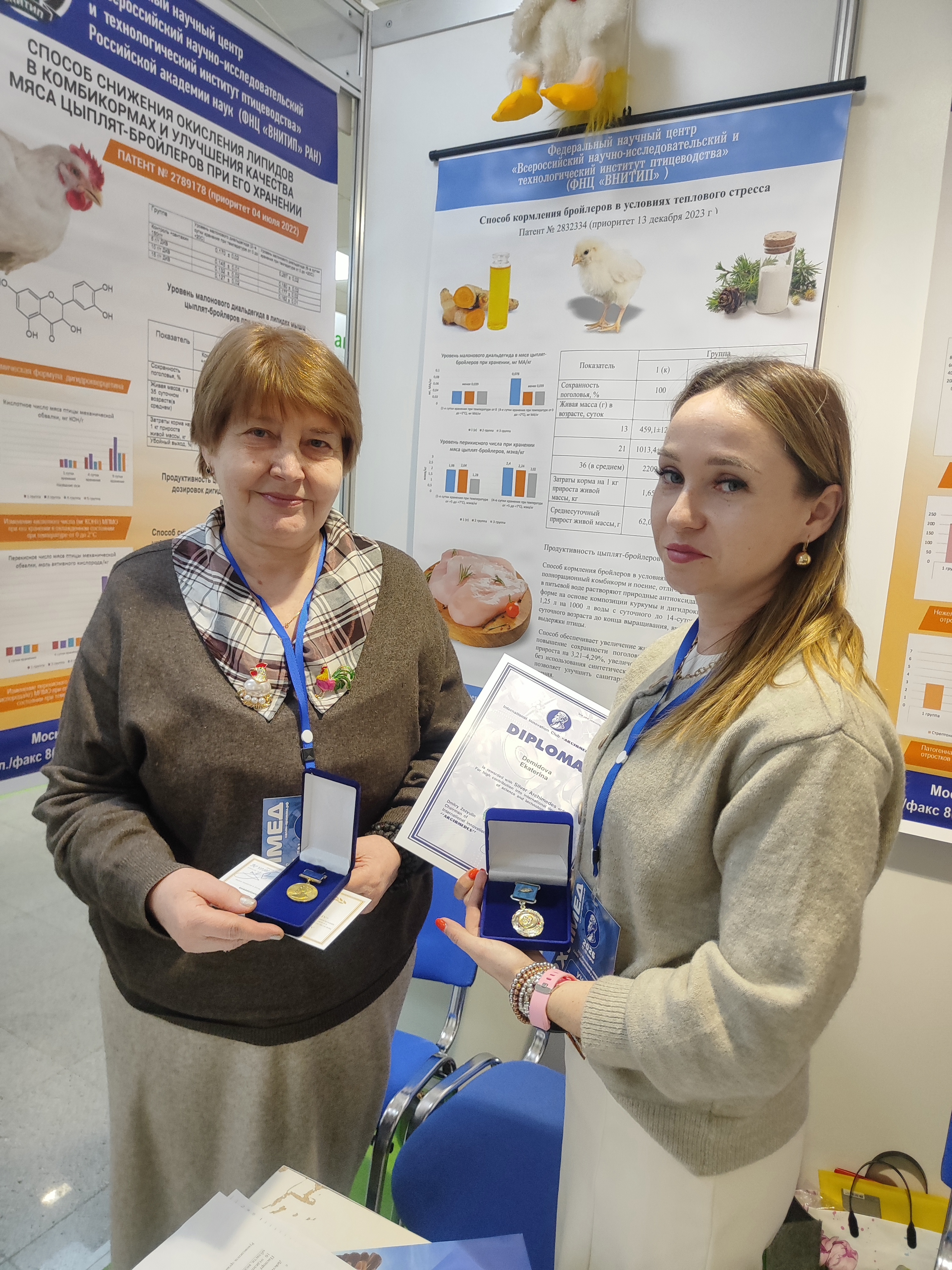 Разработка ФНЦ «ВНИТИП» «Способ кормления цыплят-бройлеров в условиях теплового стресса»», авторы Егоров И.А., Андрианова Е.Н., Демидова Е.С.. удостоена Диплома и Золотой медали.